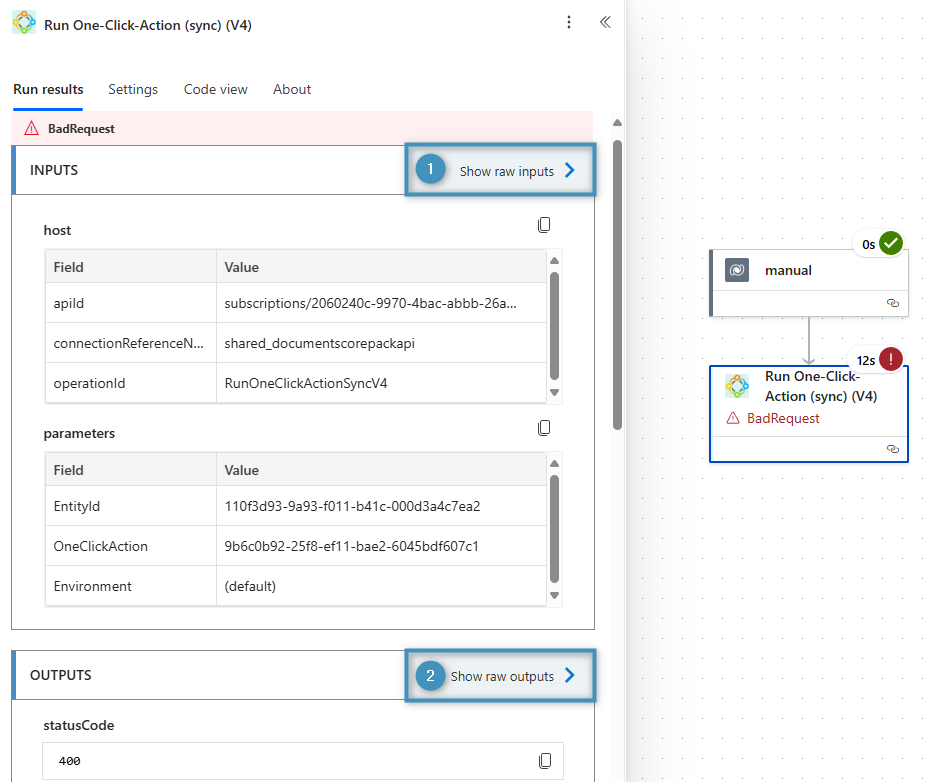 Select the action that failed. This will open a task pane that will display the run results. From here, you can select either ❶ Show raw inputs or ❷ Show raw outputs.