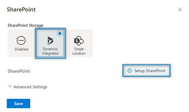 To enable Dynamics 365 Integrated SharePoint, select the setting and click Setup SharePoint.