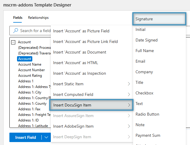 After successfully installing and configuring the e-signature solution within Dynamics 365, you can proceed to create a document using the DocumentsCorePack Template Designer. By utilizing the Insert Field option, you can seamlessly embed signature fields directly into your templates.