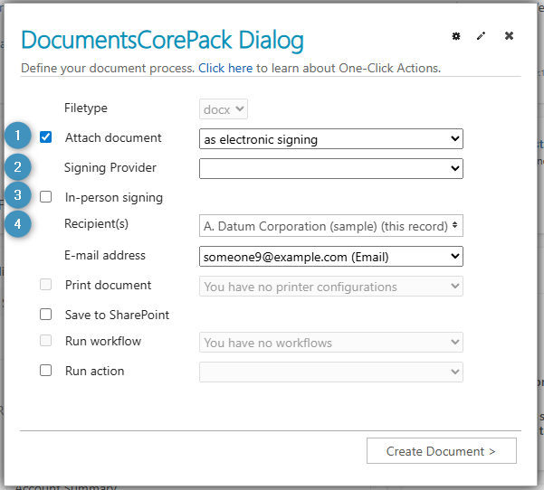 - Send generated documents for electronic signature directly from Dynamics 365