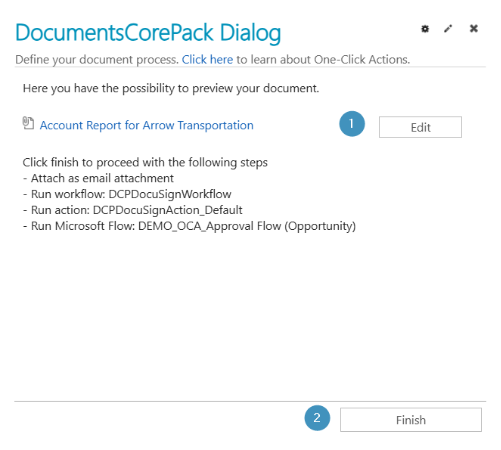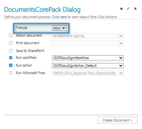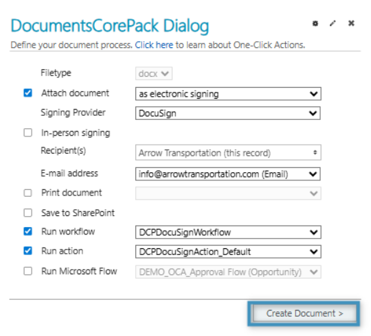 This opens the DocumentsCorePack Dialog, automatically using the data from the record you’re viewing.