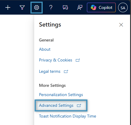 First, open Dynamics 365 and select the Settings icon from the top right. Next, click Advanced Settings from the drop-down menu.
