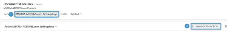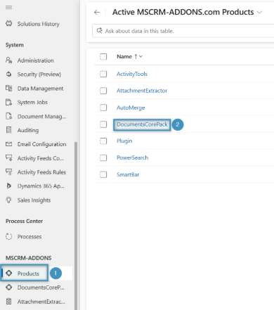 After the advanced settings page opens, find and select the ❶ Products page from the menu on the left, and click the product the key should be added to. In this case, we are selecting ❷DocumentsCorePack.