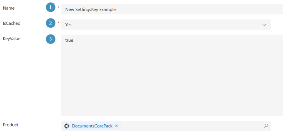 A new window will open. Here, input the values for ❶ Name, ❷ IsCached, and ❸ KeyValue. Note that the product you previously selected is correctly displayed in the bottom search bar.