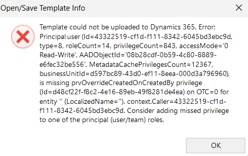Note: The Override Created on or Created by for Records during Data Import option is required in your Dynamics 365 security settings to update the Template Version. Users who lack the needed permissions will encounter this error: