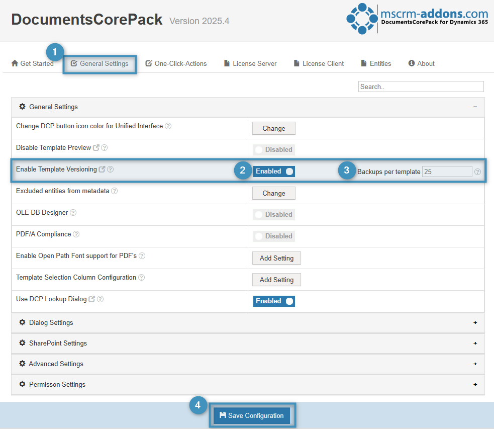 In your Dynamics 365 environment, navigate to the Power Platform Environment Settings. In the MSCRM-ADDONS column select DocumentsCorePack and open the ❶ General Settings tab. Under the ❷ Enable Template Versioning setting, select Enabled to activate it. Additionally, you can set the ❸ number of backups per template (“0” is for unlimited backups). When you are done, make sure to ❹ save the configuration.