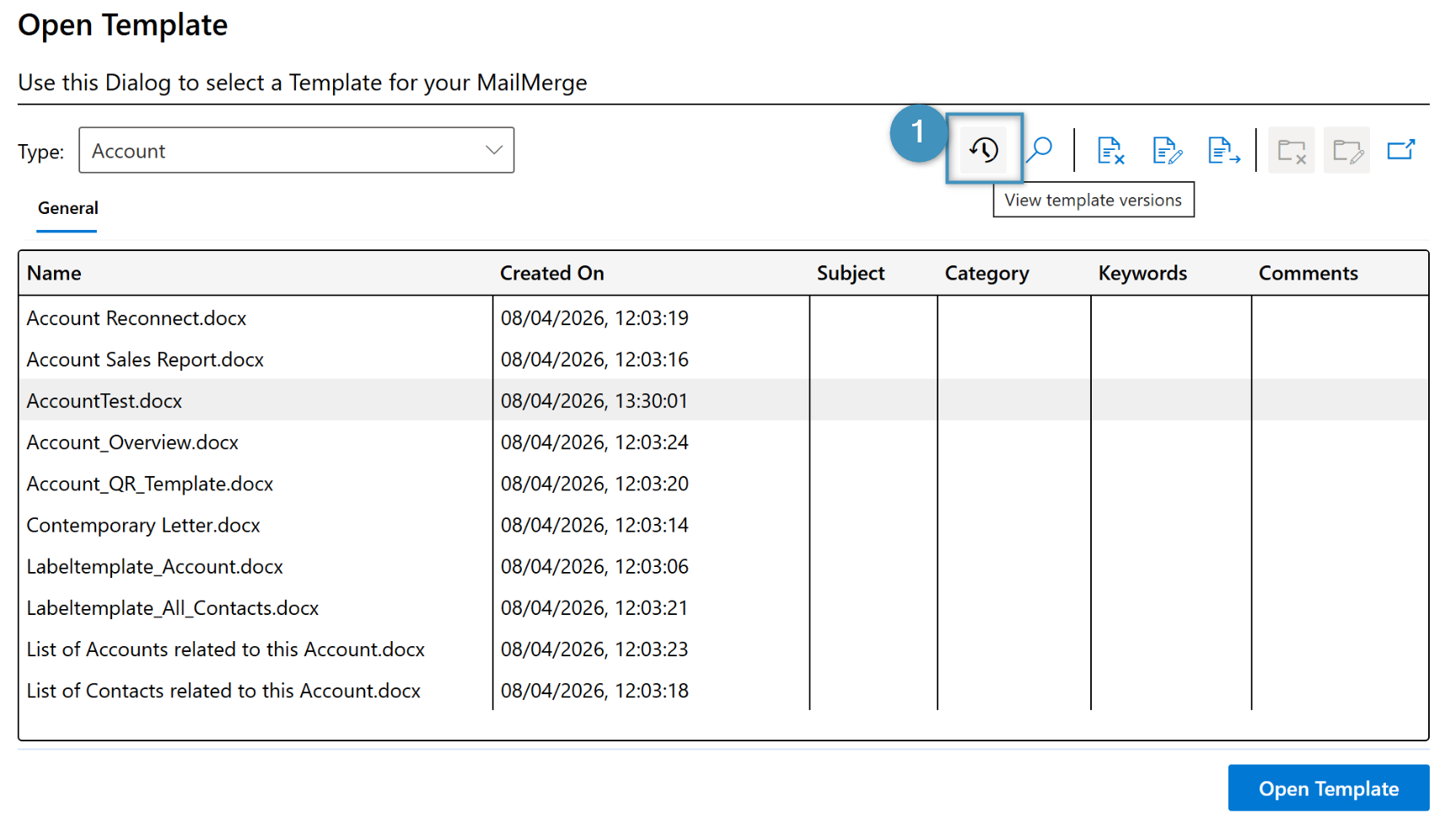 Open a Word template and click the Open Template button. A ❶ View template versions icon will be shown in the menu bar.