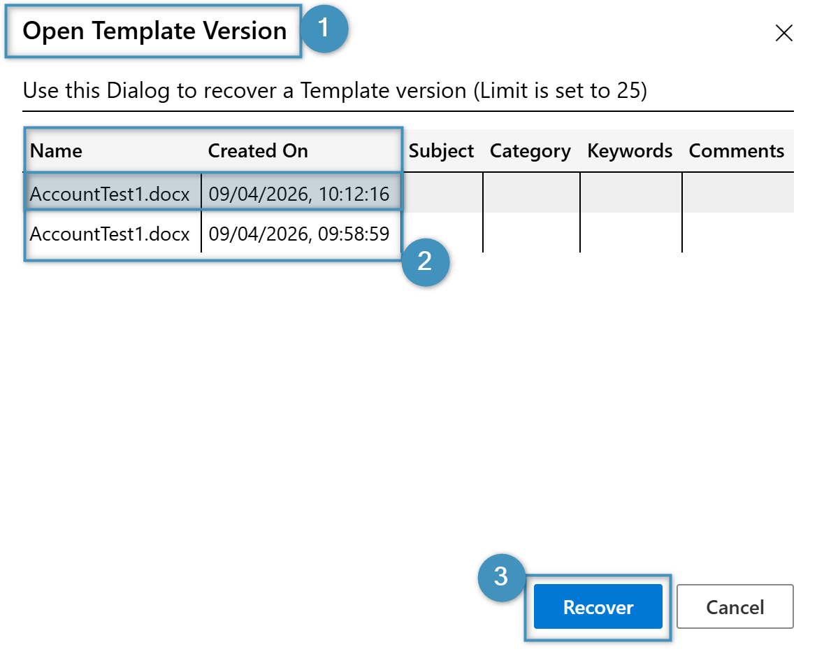 Select a template and then click on the icon. The ❶ Open Template Version window will appear with ❷ all available versions of this specific template sorted from new to old. Select the version you want to recover and press the ❸ Recover button.