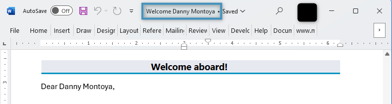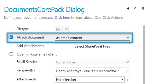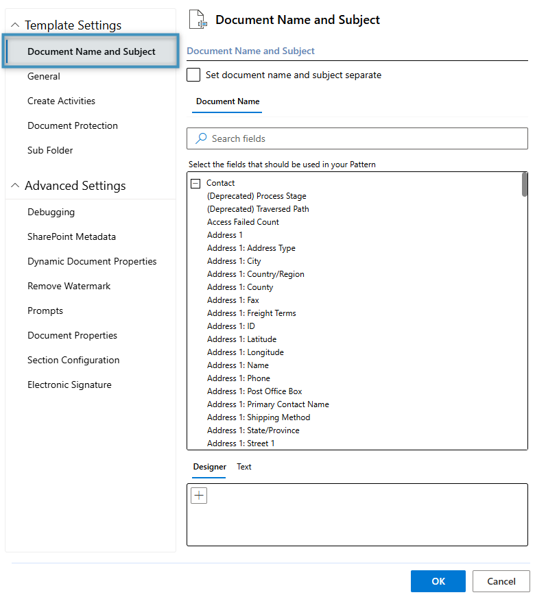 When generating documents or emails, you can define meaningful document names or subjects directly in your template, respectively. These can include both static text and values from Dynamics 365 fields, making the result clear and easy to identify.