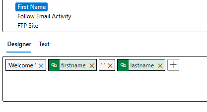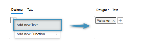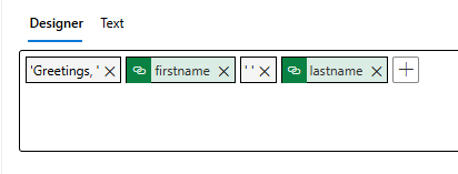 In the Designer tab, you can add both fields and static text to construct your dynamic name. To add text, click on the plus (“+”) button and select Add static text. We can use this to add the first part of our dynamic name.
