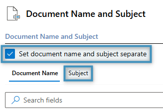Subjects for emails created during the document generation process can be set in the template separate from the document name. Defining a dynamic subject is similar to defining a dynamic document name. In fact, by default, dynamic names and subjects are set using the same value. You can set the subject separately by enabling the Set document name and subject separate setting, which will unlock a separate Subject tab.