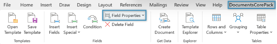 Open a Word document and navigate to the DocumentsCorePack tab. Place the cursor in the field you want to format, then click Field properties to open the options.