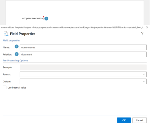 ❶ After you have inserted your desired field, place your cursor on the field and open the Field Properties (as dialog) selection from the DCP ribbon. After the dialog opens, you can see the ❷ Field Name and ❸ Relation (i.e. if field is mapped from main table or a related record).