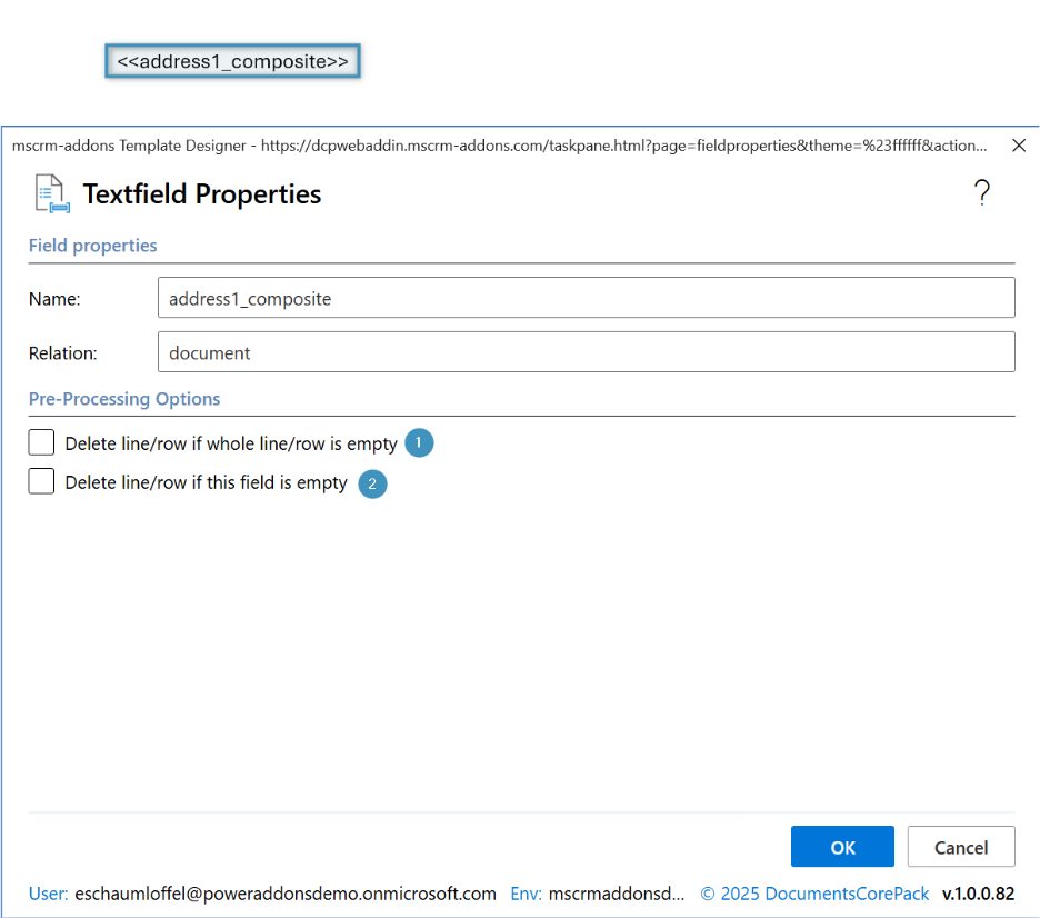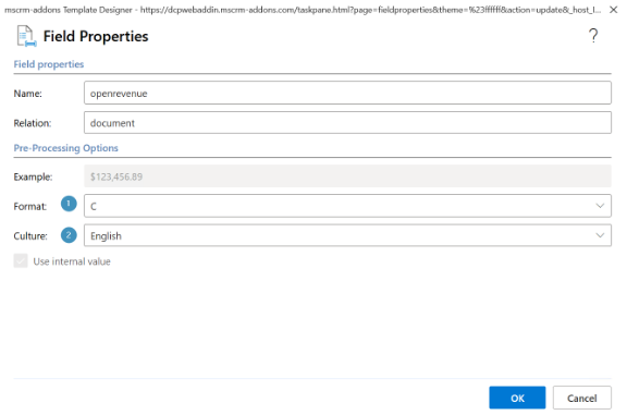 Field properties define how a field mapped from Dataverse / Dynamics 365 is rendered in the generated Word document. In DocumentsCorePack, you can set various formatting, display, and transformation options at the field level.