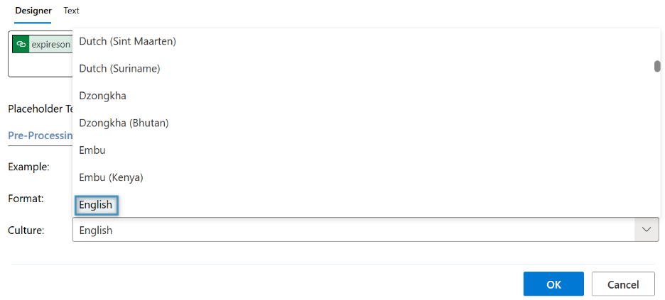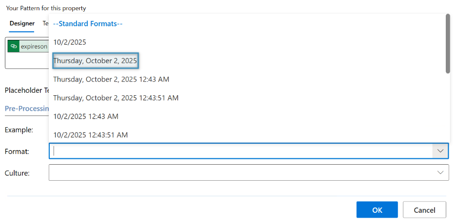 The section ❷ Formatting options offers the possibility to display the Date and Time in the respective culture . Learn more about Custom Date and Time Format Strings in DCP here.