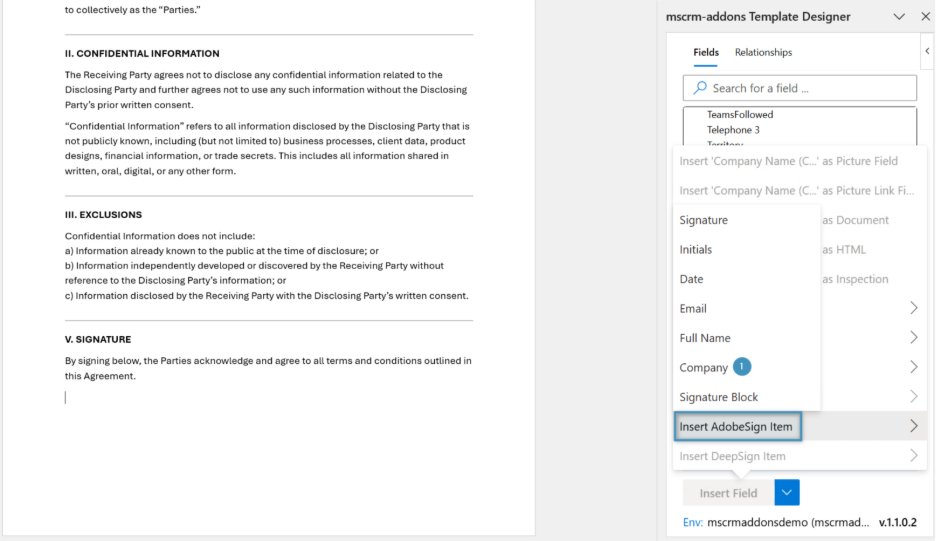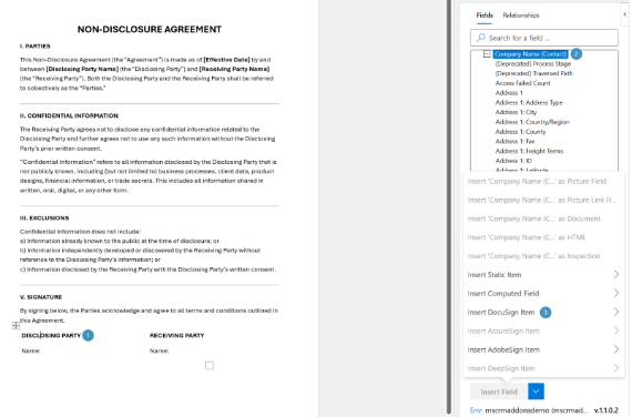 Using the same NDA Template from above, we will insert the same fields from the template designer using AdobeSign.
