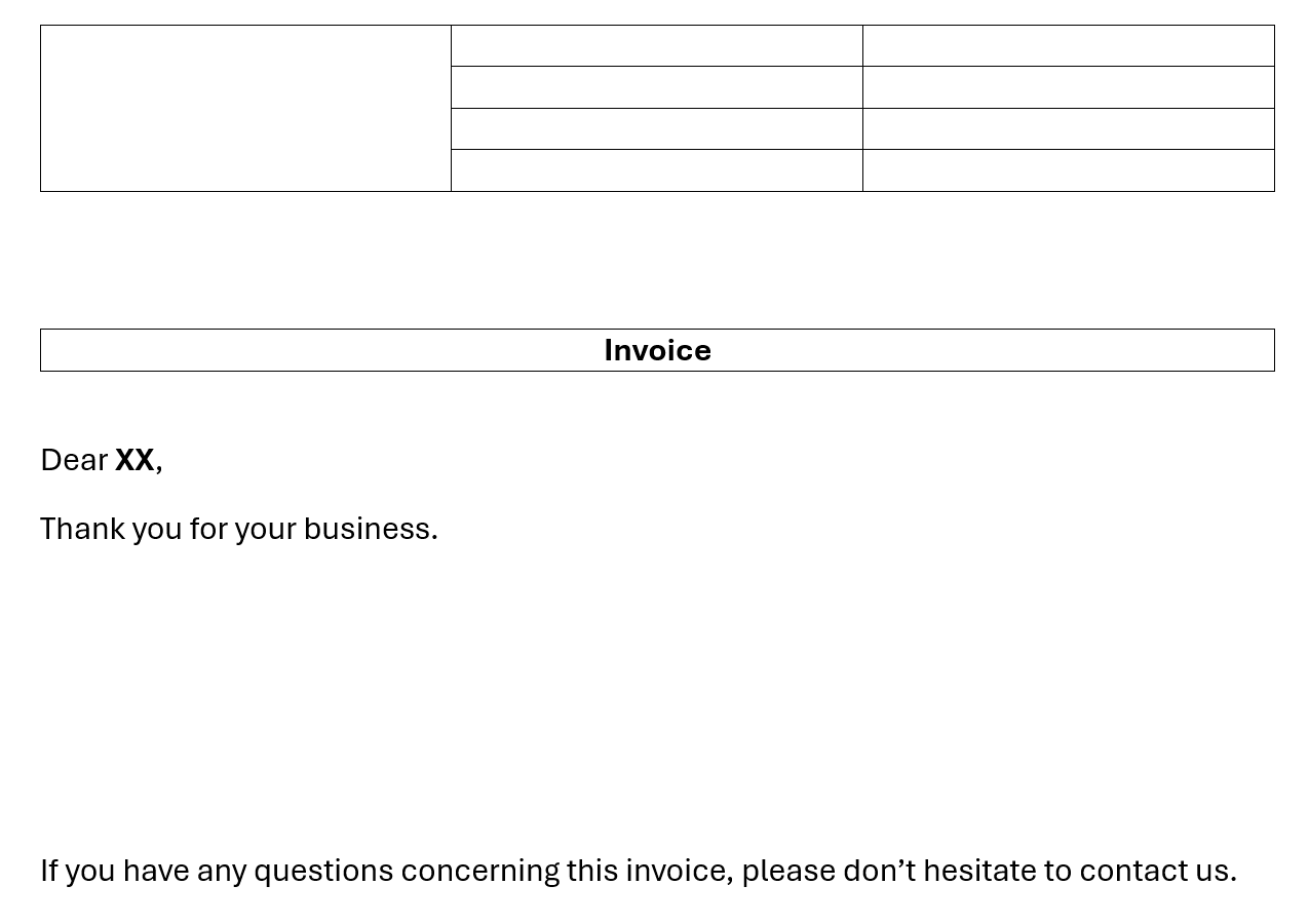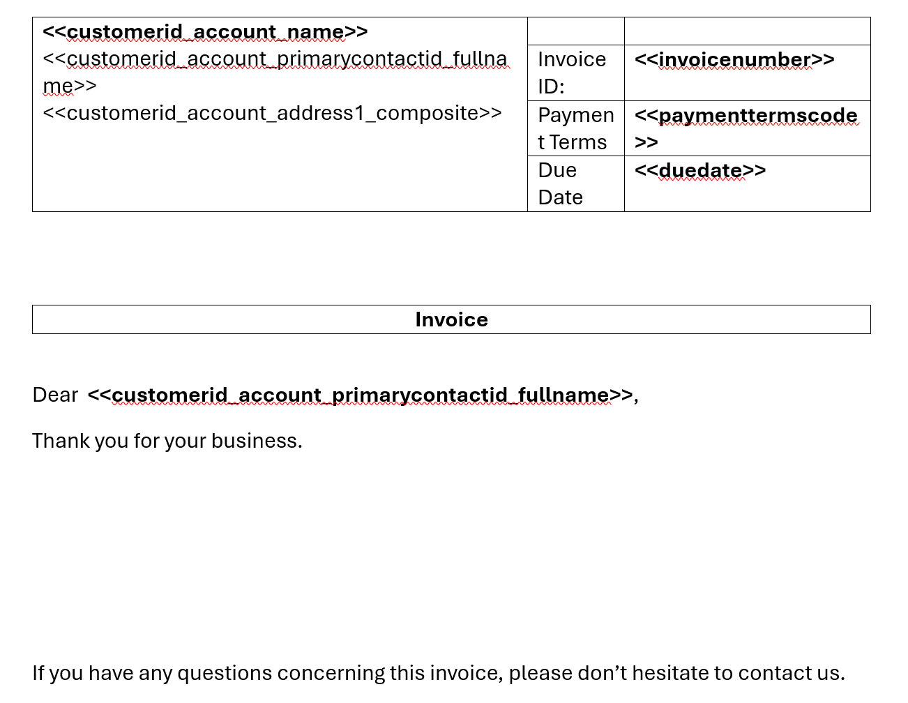 When we merge the template with an Invoice record from our system, the resulting document will look like this: