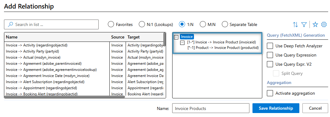 For our table, we will use the Invoice Product entity as the foundation. To set this up, we will open the Relationship Designer and locate the Invoice->Invoice Product relationship. Here we also resolve the Invoice Product->Product relationship, which is needed to add product details such as product name etc. as shown below.