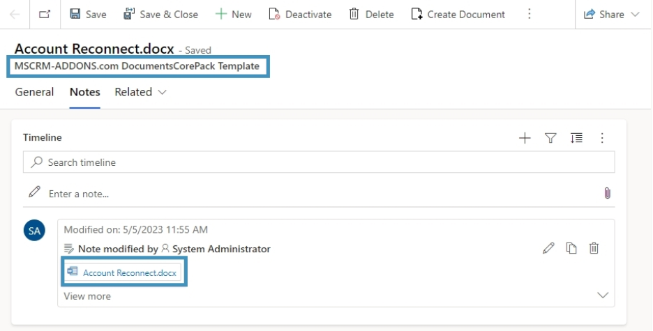 When you save a new template, it is stored in Dynamics 365 as an attachment to a so called DocumentsCorePack Template record. The record name matches the template name, and the file itself is stored under the Notes tab.