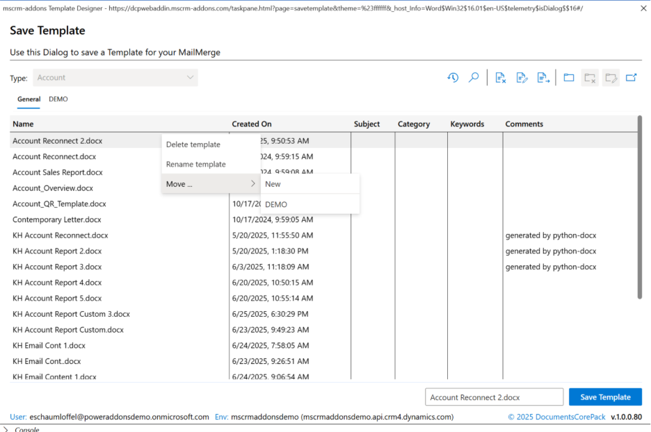 To keep templates organized, you can assign them to groups (for example: Sales, Customer Service, or Language-specific templates). Groups can be created when saving a new template in Word, or later by moving existing templates.