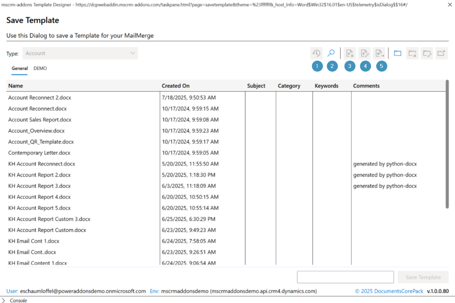 DocumentsCorePack templates are Microsoft Word-based documents designed with the Template Designer. They contain fields, tables, and placeholders that pull data directly from Dynamics 365 or Dataverse.