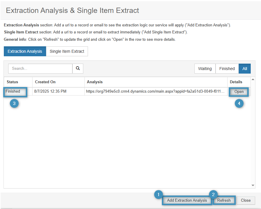 In the opened window, click on ❶ Add Extraction Analysis and paste the URL of a relevant record, such as an Account or Email, that contains the item to be analyzed. You can click on ❷ Refresh to check the item’s status. Once the status is listed as ❸ Finished, click ❹ Open. Then, copy the Extraction Analysis Report and send it to our support.