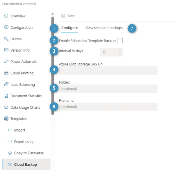 You can manage template backups in the system. ❶ Configure tab, as shown below. Here, you can ❷ enable scheduled template backups and decide on the ❸ interval in days. Make sure to set your ❹ Azure Blob Storage SAS URL. Optionally, you can set the ❺ folder and ❻ filename. You can view your backups in the ❼ View Template backups tab.