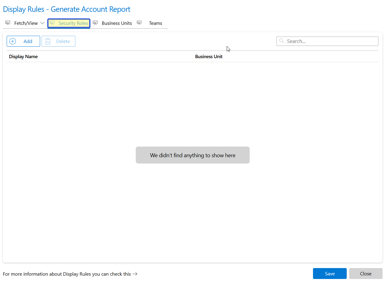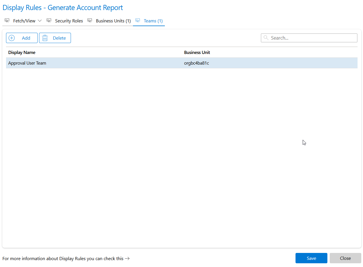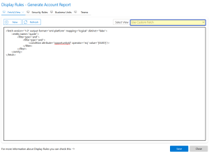• Display rules via Fetch – Enter a Fetch-XML query for complex conditions.