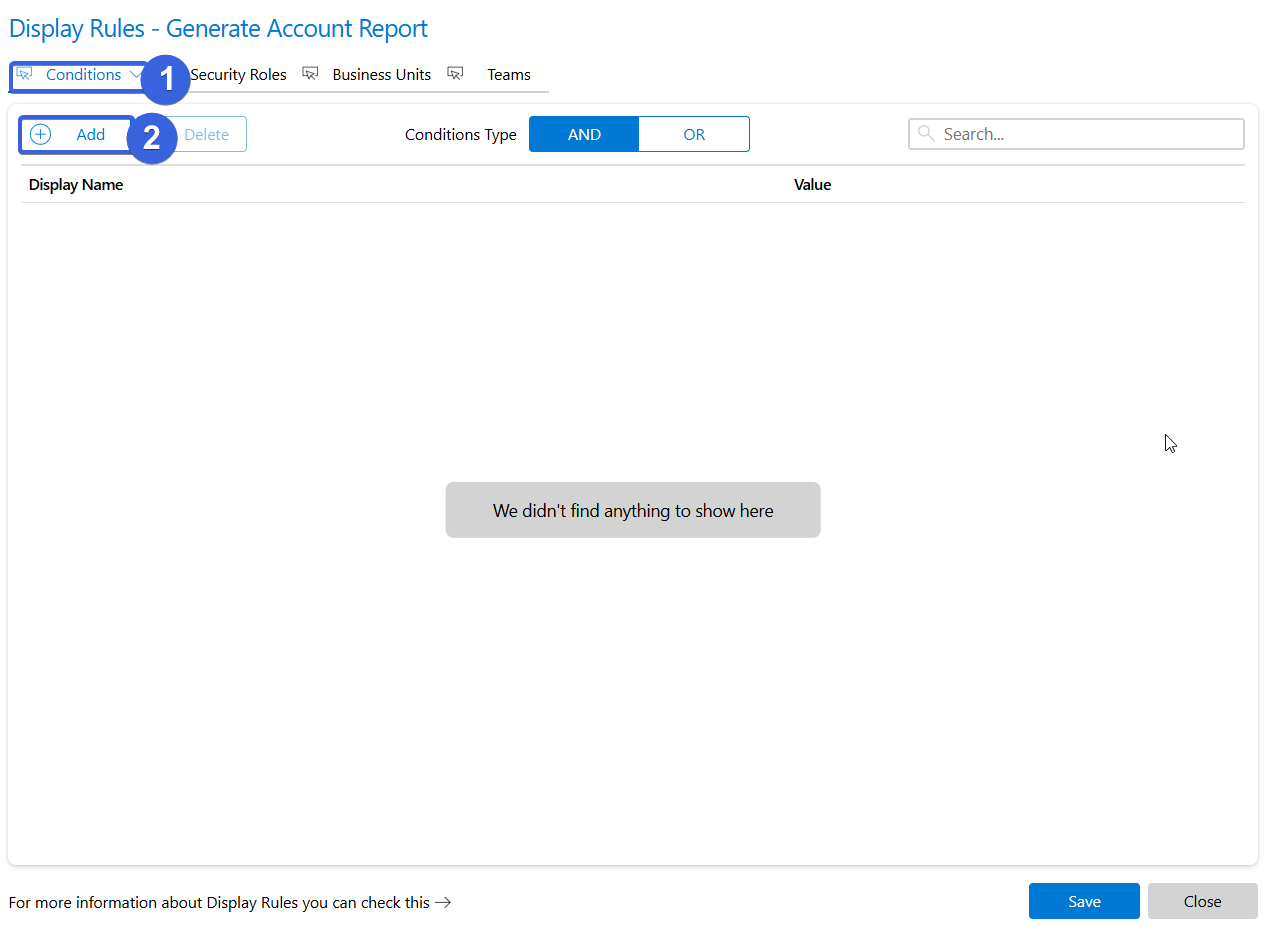 Please Note: These four types of display rules (Conditions, Security Roles, Business Units, and Teams) are linked. This means that at least one condition from each configured tab must apply for the OCA to be displayed.