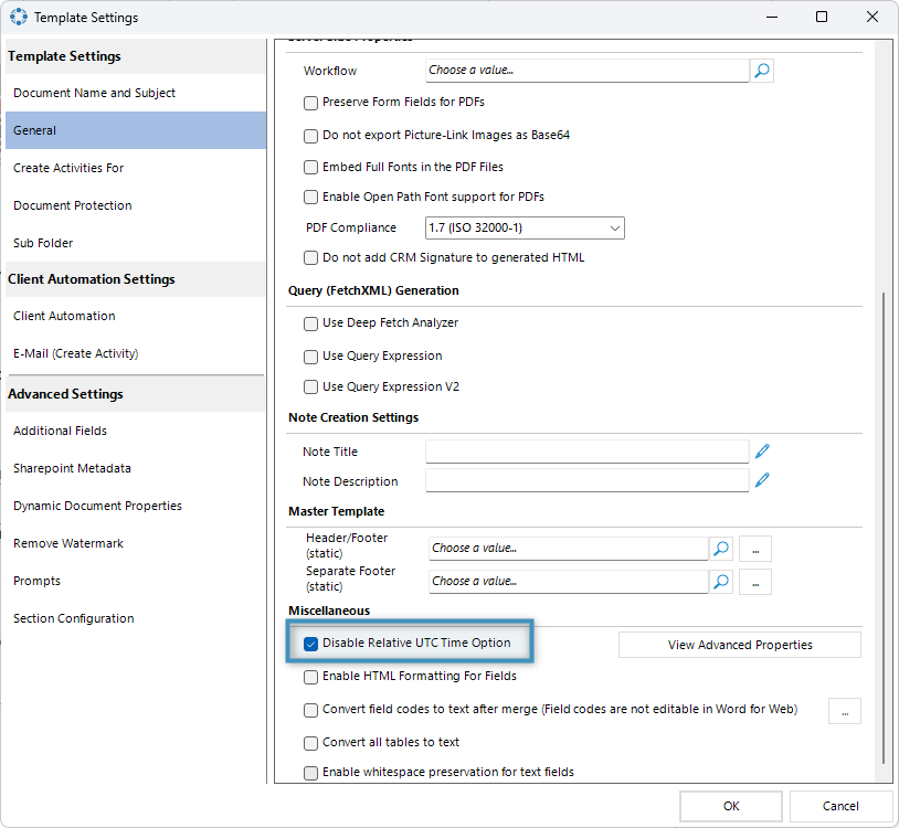 Keep in mind that this setting only impacts DateTime fields retrieved from records. It has no effect on DateTime fields created through Advanced String or calculated dates created via the DateTime field option under Insert Field. Additionally, this setting has no effect on documents generated in your Dynamics 365 environment (e.g. via the Dialog). This is only for use in creating documents via the Template Designer. We do not recommend using this setting unless otherwise instructed to by our support team.