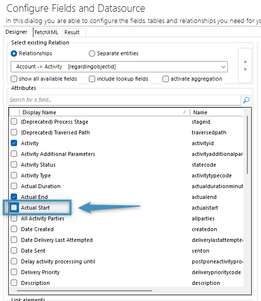 The Configure Fields and Datasource dialog will open. Select a relationship you would like to insert ❶ and add attributes by checking the boxes next to the attributes ❷. In the example below, we have chosen the relationship Account > Activity [regardingobjectid] and added the following attributes: Activity, Actual End, Actual Start, and Due Date.