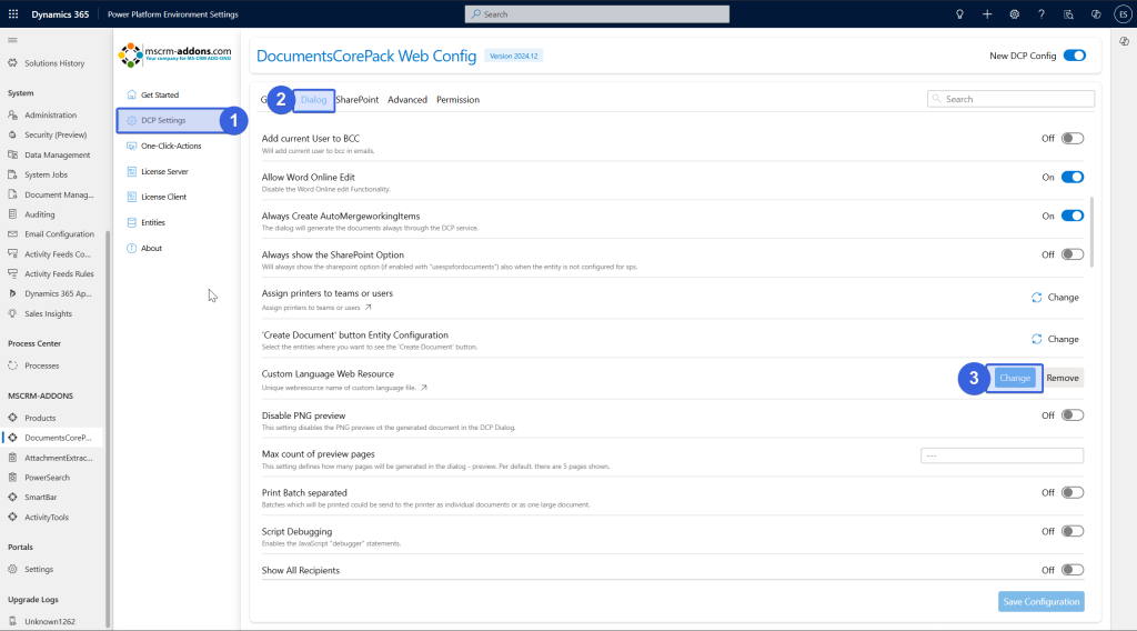 To set the language, first ensure that the language has been added to your Dataverse environment by accessing the ❶ Power Platforms Environment Settings and navigate to ❷ Administration > ❸ Languages.