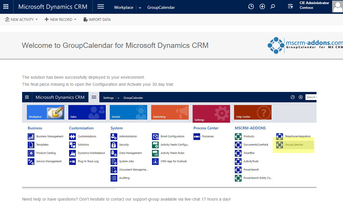 Now open CRM Online and click on Workplace > MyWork > GroupCalendar. The so opened window provides you with the information required to activate GroupCalendar.