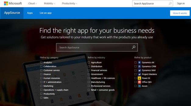 1) To open AppSource, navigate to https://appsource.microsoft.com/en-us/.