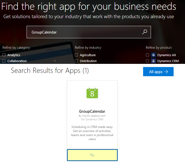 2) Please look for GroupCalendar in the Search field and click on the [Try]-button in the Group Calendar result box.