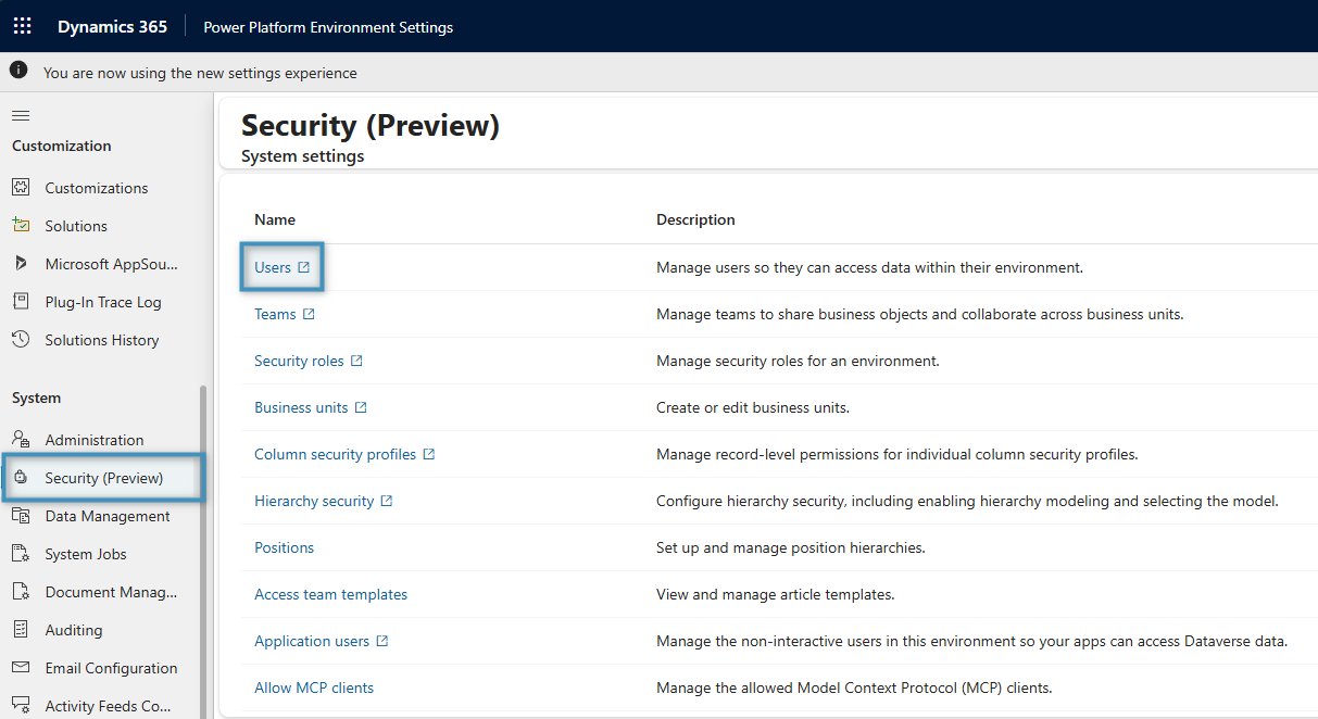 To find this information, begin by navigating to the Power Platform Environment Settings in your Dynamics 365 environment and click on the Security (preview) button. Then, click on Users.