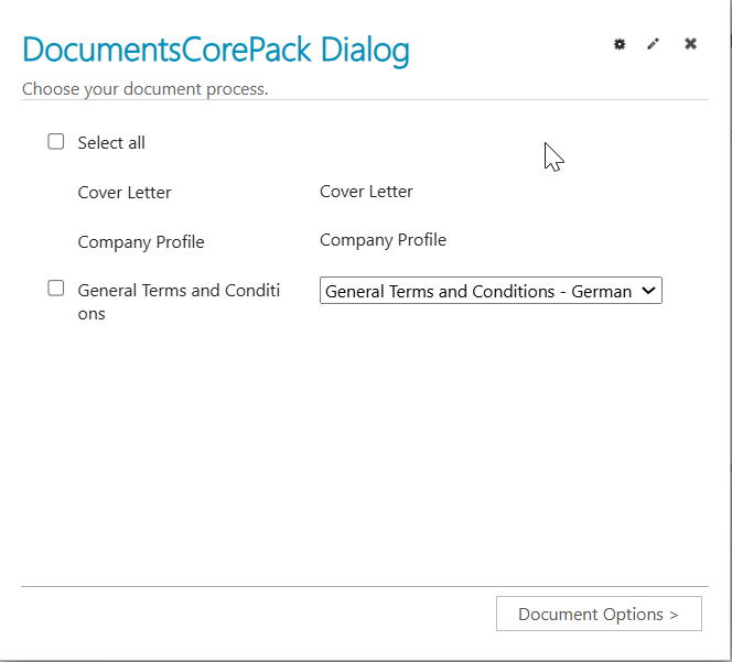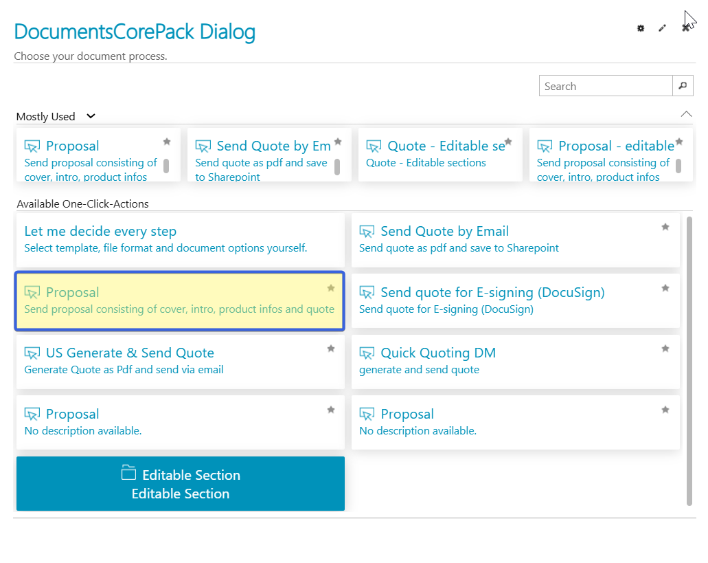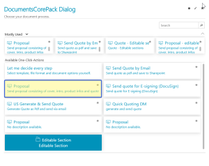 Now, when a Dynamics 365 user clicks on the Create Document button, he will automatically be provided with the new OCAs. In the example, you can see the available OCA named Proposal.