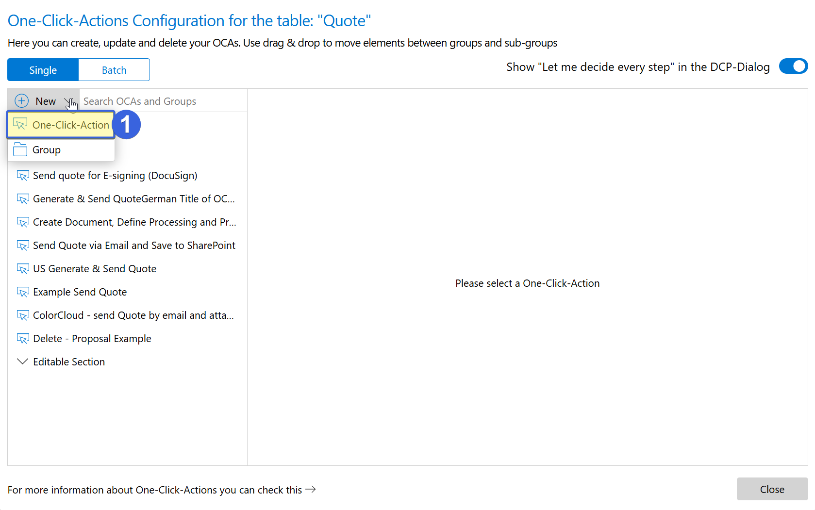 ❷ Enter the name of your action and press OK. You will be provided with the configuration window for Single Record Actions. Follow the next steps to configure your action in detail.