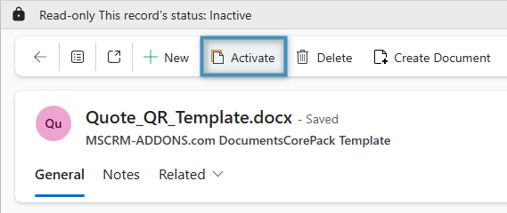 Templates deleted from the Open/Save dialog are only “soft” deleted. They can be restored by accessing the template’s corresponding record in Dynamics 365 (Table: MSCRM-ADDONS.com DocumentsCorePack Template) . By reactivating the record, the template will be available again.