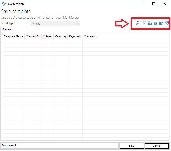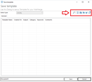In the upper right corner of the Save Template dialog, you’ll find several management tools: