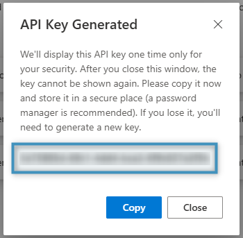 Step 3: The API key will be generated. Note that the key will only be displayed once. Please make sure to copy it before closing the window.